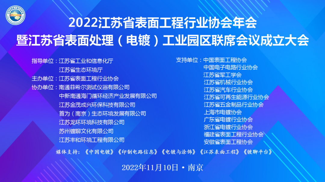 2022年11月10日由江苏省表面工程行业协会主办的“2022年江苏省表面工程行业协会年会暨江苏省表面处理(电镀)工业园区联席会议(以下简称:联席会)成立大会”在江苏省会议中心举办,江苏梦得新材料科技有限公司董事长杭冬良先生、总经理杭康先生受邀参加了此次会议。