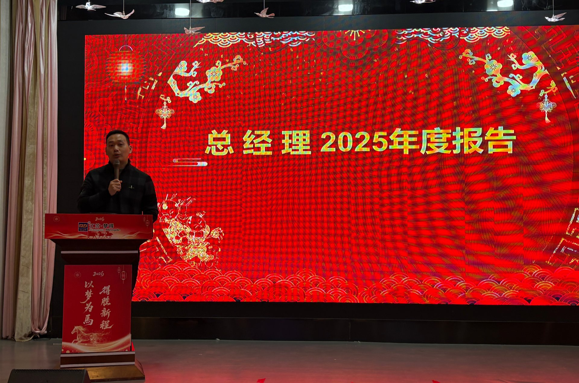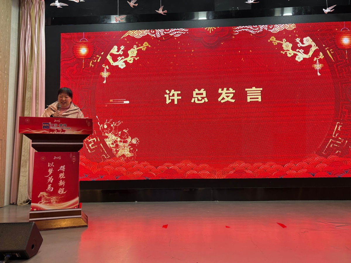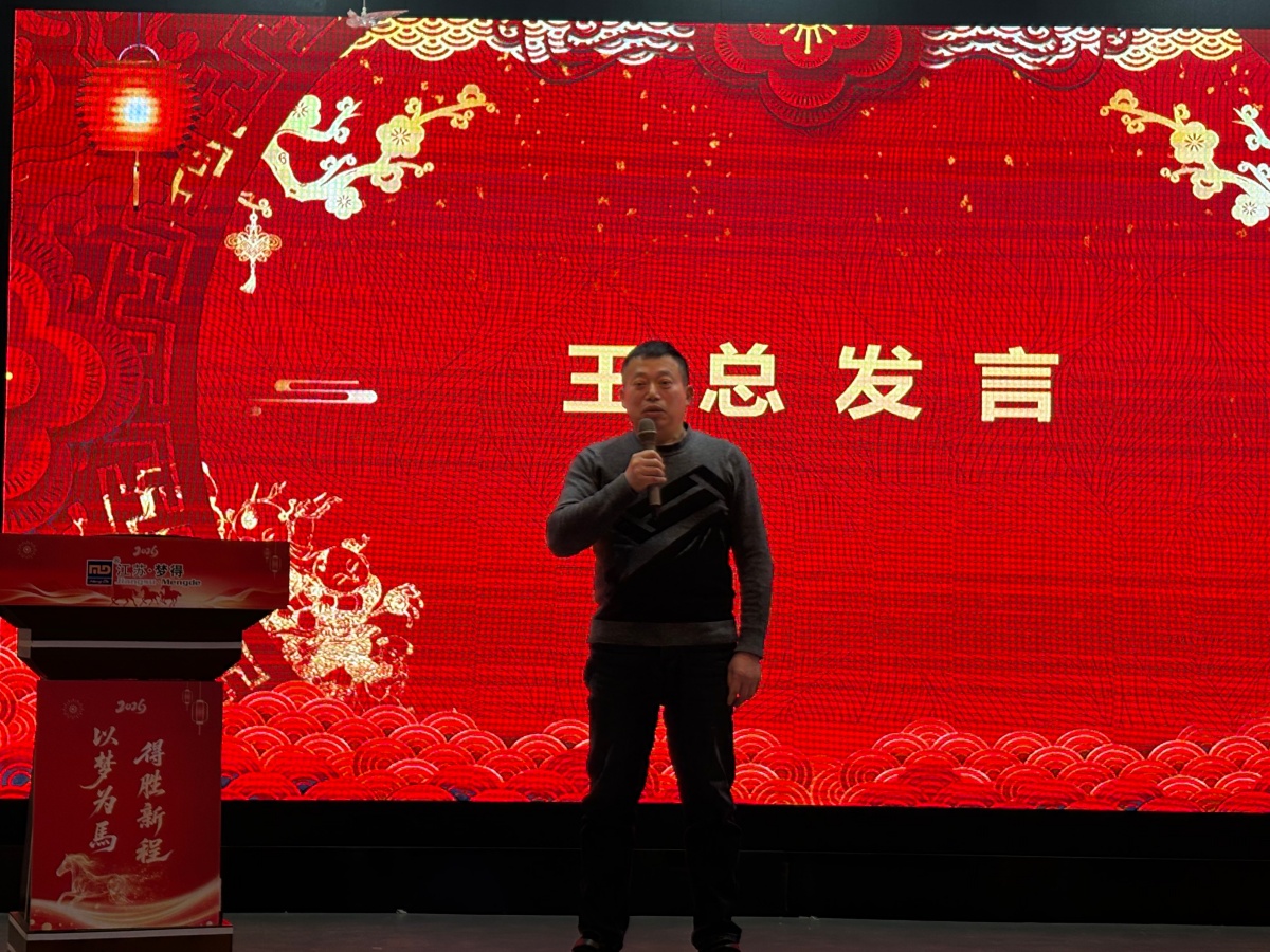 佳绩的背后,离不开领导班子的高瞻远瞩,更凝聚着每一位梦得人的拼搏与坚守。总经理杭康先生的年度报告,既是对过往的复盘,更是对未来的宣言。他用一组组详实的数据、一个个亮眼的成果,回顾了 2025 年江苏梦得的辉煌成就与成长足迹:从核心产品的技术突破到市场份额的稳步扩张,从团队凝聚力的持续增强到品牌影响力的不断提升,每一份成绩的背后,都凝聚着全体梦得人的汗水与坚守。同时,杭总深刻剖析了行业发展趋势与市场机遇,清晰擘画了 2026 年的宏伟蓝图,提出了切实可行的发展目标与战略规划。他强调,新的一年,全体同仁需继续秉持公司核心价值观,以 “行则必至” 的坚定信念,凝心聚力、勇攀高峰,共同书写江苏梦得更加璀璨的篇章。