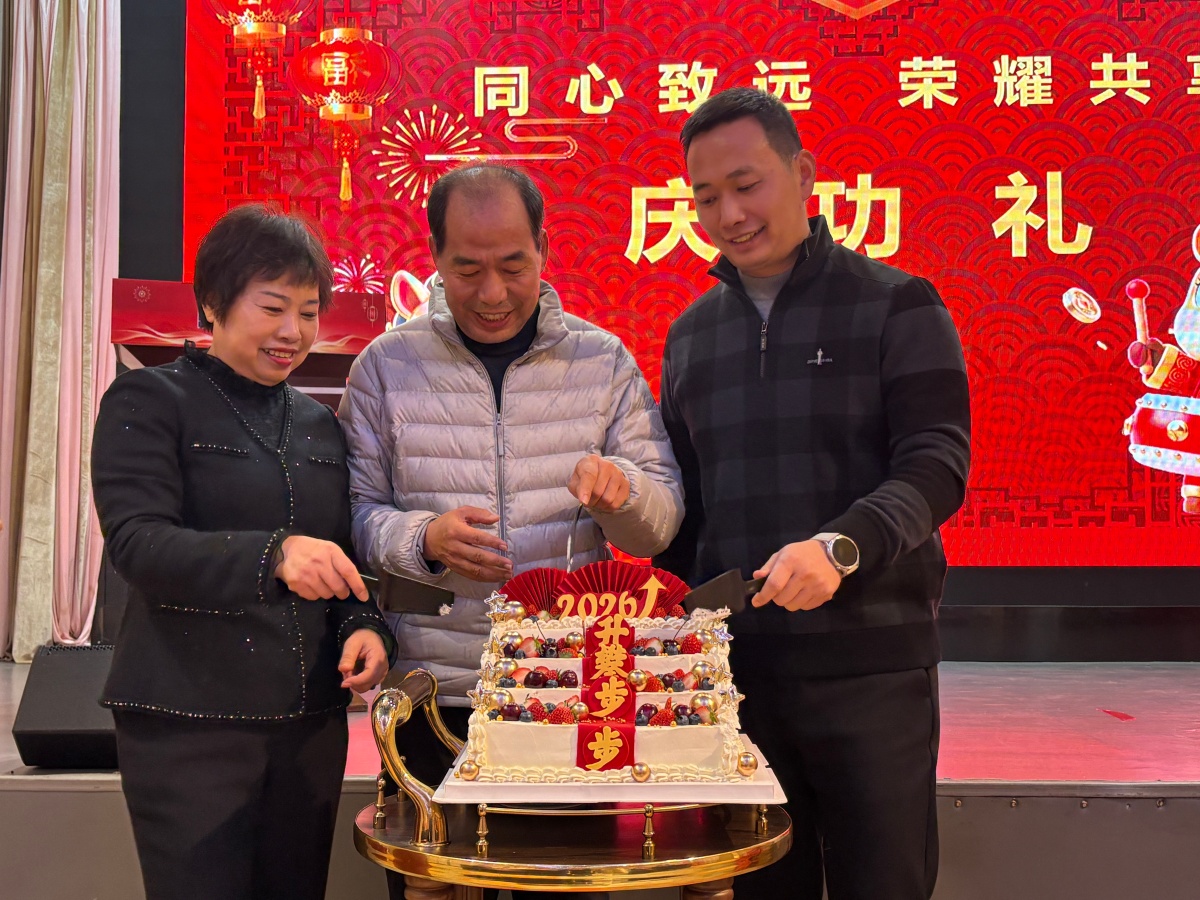 董事长杭冬良先生、总经理杭康先生、公司副总经理贡建华女士共同走上舞台,手持特制的刀具,在全场同仁整齐划一的倒计时声中,一同切开了这象征着团圆、喜悦与希望的庆典蛋糕。“3!2!1!” 当刀刃落下的瞬间,现场掌声雷动、欢呼声此起彼伏,闪光灯记录下这一温馨而神圣的时刻。这蛋糕,甜在舌尖,暖在心底,不仅是对过往坚守与付出的犒赏,更是责任与传承的象征,是梦得人同心同德、共赴未来的美好见证。愿江苏梦得如这蛋糕般层层递进、蒸蒸日上,2026 年续写更多辉煌篇章;愿每一位梦得人都能共享公司发展成果。